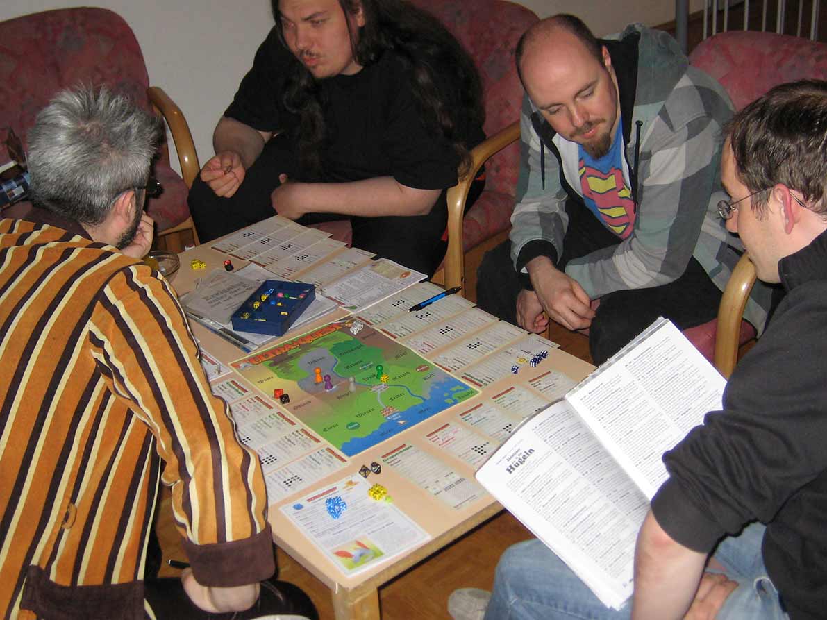 Das Spiel beinhaltet auch kompetitive Elemente (z.B. Diebstahl oder Handel), aber eigentlich spielt jeder seine Heldengruppe parallel zu den anderen.