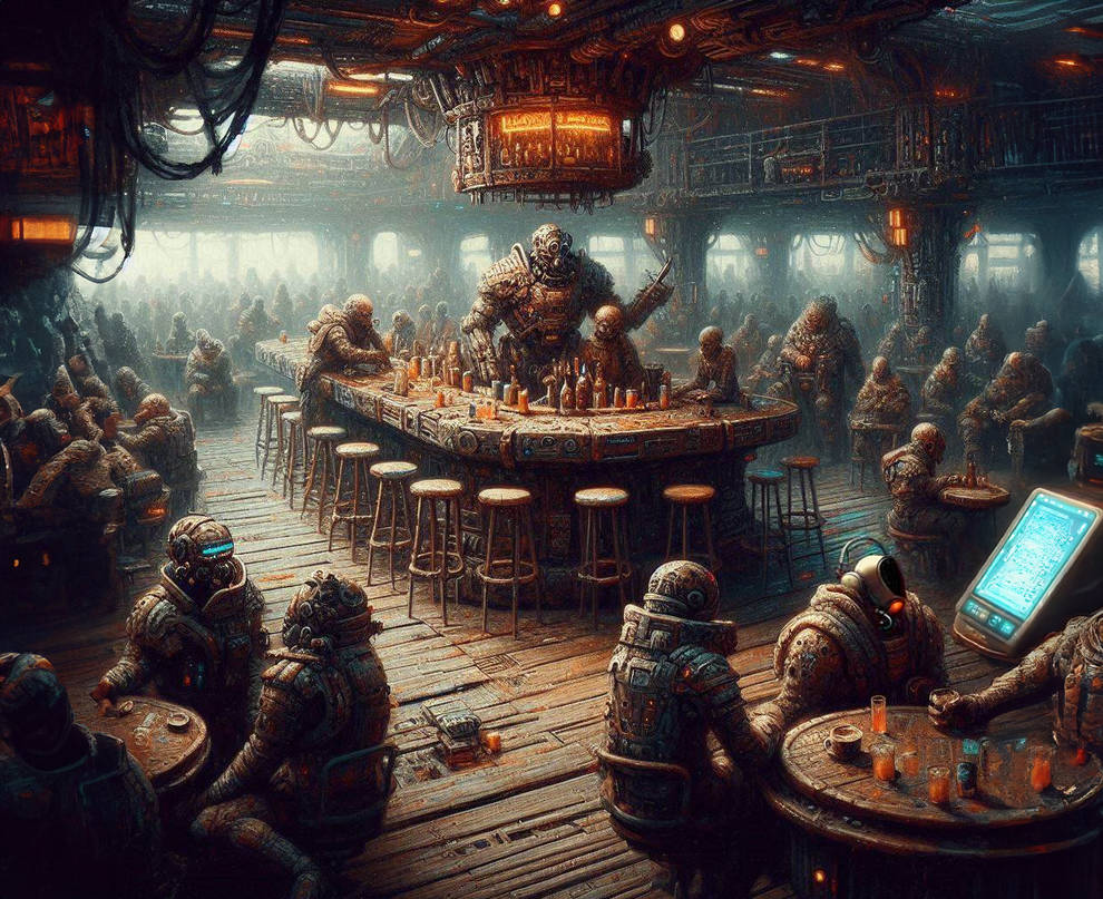 Eine der kleinen Hafenbars von Portal trägt den beschaulichen Namen ‚Scrap Metal‘, die Theke und die Tische sind nämlich krude aus Raumschiffschrott zusammengeschweißt. Es hat einen gewissen Charme, findet May. Hier hat sie für sich und Rex einen Tisch in der hintersten, dunkelsten Ecke gesucht, ganz so, wie sie es früher immer im Old Moon Saloon gemacht haben.